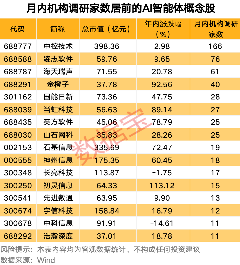 据证券时报·数据宝统计,AI智能体概念股有200余只,今年以来,17股的股价上涨幅度均超100%,品茗科技、开普云、宏景科技的股价涨幅居前,年内分别上涨648.82%、264.2%和228.59%。
