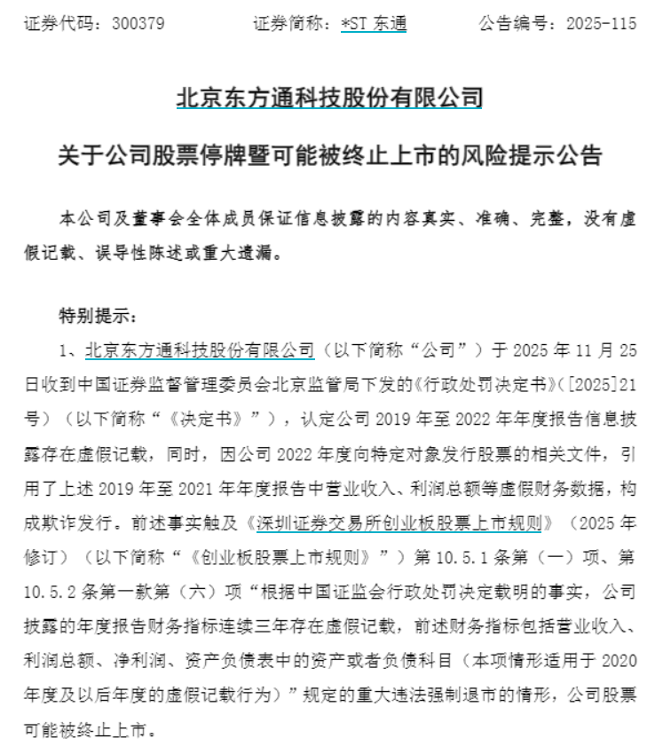 11月25日晚,*ST东通(维权)(300379)发布公告称,公司收到中国证券监督管理委员会北京监管局下发的《行政处罚决定书》,认定公司2019年至2022年年度报告信息披露存在虚假记载,同时构成欺诈发行。该行为触及《创业板股票上市规则》规定的重大违法强制退市情形,公司股票可能被终止上市。根据相关规定,公司股票自2025年11月26日起停牌。